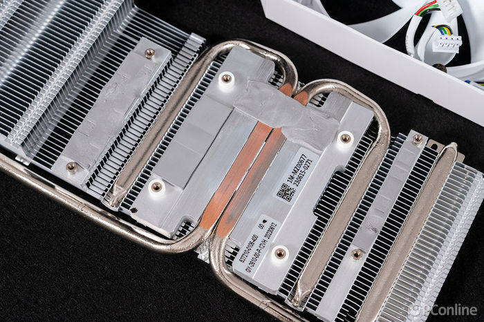 散热方面,耕升RTX 4060踏雪也没有拉下,一拆开就看到了大面积的高效能均热板,中间还有两根热管直触核心,有利于热量快速带离。