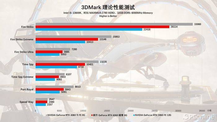 首先是3D Mark的理论测试,耕升RTX 4060踏雪上来就展现了RTX 40系应有的实力,相比较于上一代的RTX 3060,综合下来理论性能提升了13%左右。在DX 11为基准的Fire Strike系列测试中,28114的超高成绩比后者高出近6000分;而以DX 12为基准的TimeSpy测试也相当强势,超过了RTX 3060有近2000分。