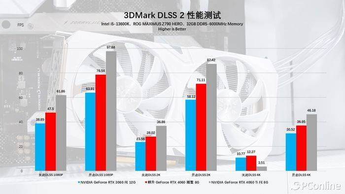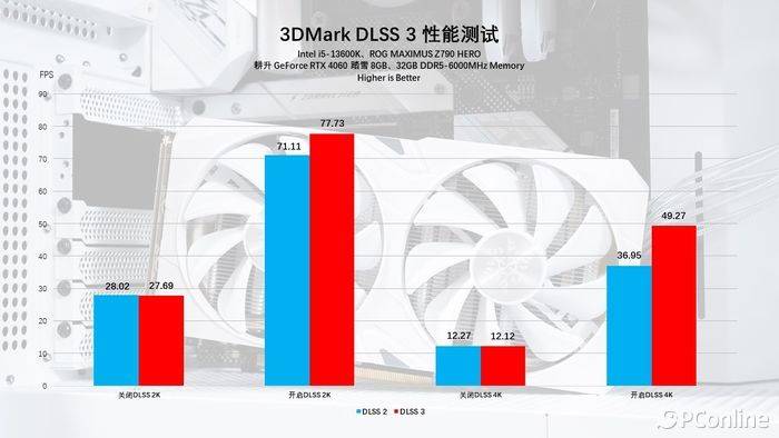 实测在3DMark的DLSS 3测试中,耕升RTX 4060踏雪的表现相当出色。2K分辨率下,开关DLSS 3性能差距能够达到2.8倍以上,帧数稳定在77 FPS以上,这与上面游戏测试一致,可以看到它是有2K游戏的能力的。4K分辨率下,开关前后差距足足有4倍,不过49 FPS的成绩还不能够支撑你的4K游戏体验。