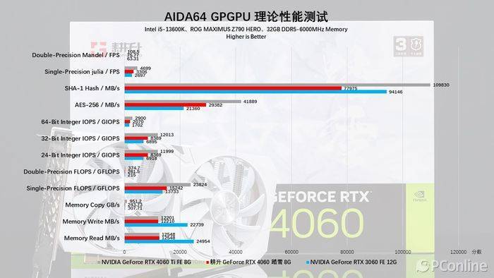 至于其他理论性能,我们也进行了详细的测试,从实测结果来看,在AIDA 64的GPGPU测试里,拥有Ada Lovalace架构的RTX 40系列显卡在算力上也有出色的性能表现。