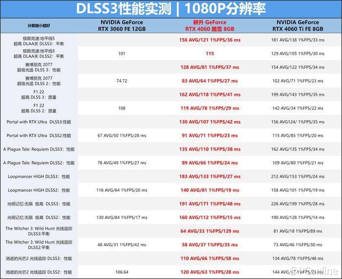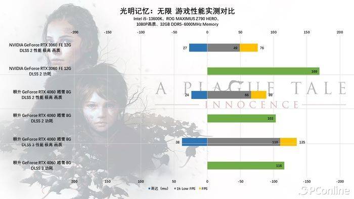 光看理论性能大家也不过瘾,现在的DLSS 3游戏这么多,不实测一下怎么行。在国产FPS游戏《瘟疫传说:无罪》中,耕升RTX 4060踏雪开启DLSS 3后对RTX 3060简直是降维打击,1080P分辨率下比RTX 3060高出60多 FPS。另外整个游戏过程中,耕升RTX 4060踏雪的功耗仅116W,而隔壁的RTX 3060 基本在170W徘徊。用更低的功耗实现了更强的性能!这点不得不说老黄确实厉害。