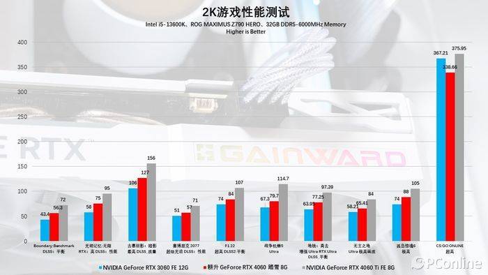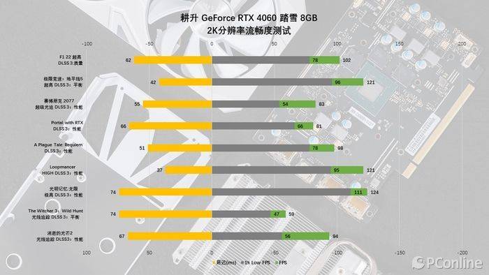 而2K分辨率,显存位宽的削减对这张RTX 4060 其实影响不大,毕竟有超大L2缓存和最新架构加持,不少游戏依旧有60 FPS的表现,不要忘了这还只是开启DLSS 2的效果,现在已经有越来越多的游戏支持DLSS 3,打开后游戏性能还能更进一步。