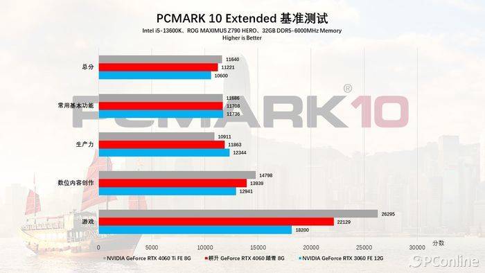 惯例,先理论性的测试一下,在PCMark 10 Extended中,耕升RTX 4060踏雪在多个项目均领先RTX 3060,不过领先最多的应该还是游戏这一项,领先幅度达到了20%,毕竟这是一张有DLSS 3的新显卡,性能强那也是意料之中。