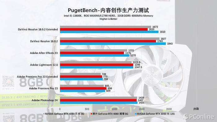 视频创作方面,我们用PugetBench模拟大家使用Adobe、DaVinci等创作软件的情况。在Adobe的应用中,其实二者差距不大,这也是因为Adobe对硬件要求不高所致。不过值得一提的是DaVinci,作为首批支持AV1格式的剪辑软件,耕升RTX 4060踏雪在这款软件里可以说是如鱼得水,丝滑的剪辑体验以及战未来的格式编码都是RTX 3060无法比拟的。