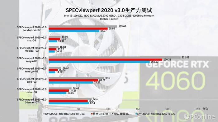 在集成了众多工业软件基准测试的SPECviewperf2020中,耕升RTX 4060 踏雪也是形成了对RTX 3060的多方位提升,整体性能提升超过20%,对于有相关需求的用户来说更加适合购买。