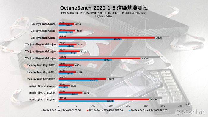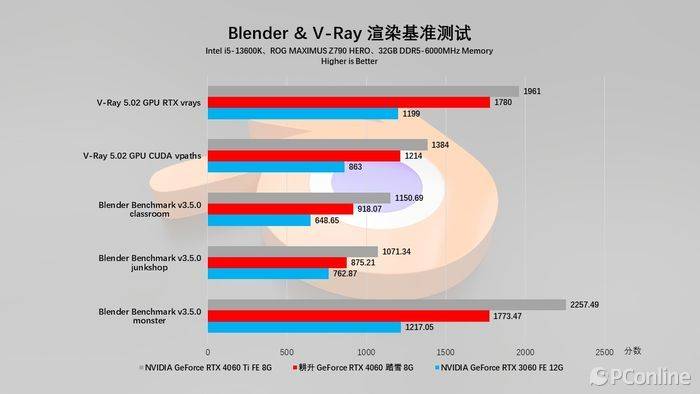 在渲染能力方面,笔者采用到了V-Ray5 Benchmark 以及Blender Benchmark来对RTX 3060 以及耕升RTX 4060踏雪进行相关的对比。从两个项目的测试可以看到耕升RTX 4060踏雪的优势相当明显,相比较于RTX 3060拥有更好的表现,性能提升足足有40%。