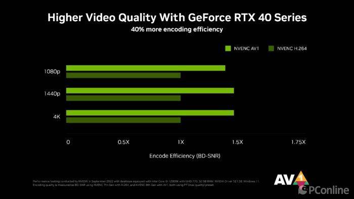 GeForce RTX 40系列显卡还有一个全新的升级,那就是编码器NVENC。第八代的NVENC编码器不仅支持H.264与H.265,还支持开放式视频编码格式 AV1。