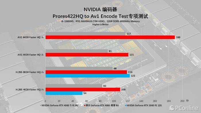 我们使用NVIDIA提供的8K片源与工程文件分别测试AV1格式和H.265格式下的编码时间。实测同一段素材下,同样使用H.265编码,有NVIDIA编码器的加持下,耕升RTX 4060踏雪的效率比RTX 3060要快一些,如果使用AV1编码,那RTX 3060就更没法比了,毕竟AV1的编解码目前还是RTX 40系的独门秘技。