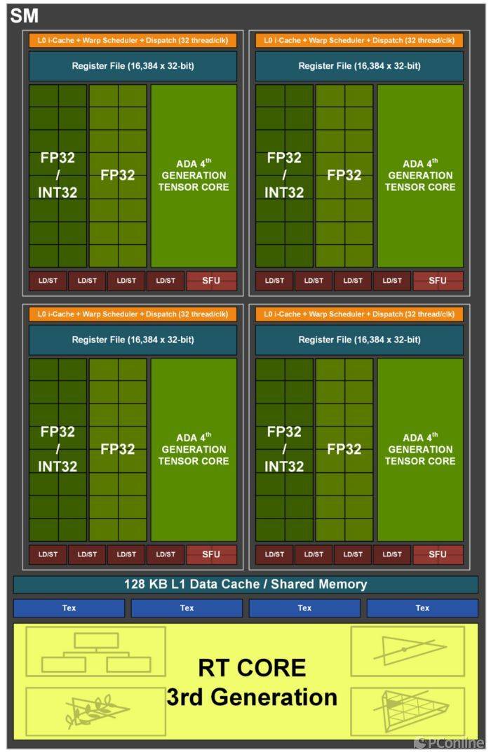 Ada Lovelace架构中最大的亮点之一:全新的SM流式多处理器,每个SM包含了128个CUDA核心、1个第三代的RT Cores、4个第四代 Tensor Cores(张量核心)、4个Texture Units(纹理单元)、256 KB Register File(寄存器堆),以及128 KB L1 数据缓存/共享内存子系统,于是这一个全新的SM单元有着超过上一代2倍之的性能表现。