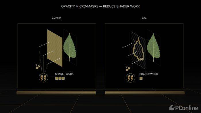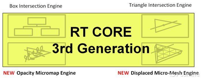 所以在第三代 RTX Cores增加了两个重要硬件单元:Opacity Micromap Engine与Displaced Micro-Meshes Engine引擎。Opacity Micromap Engine,主要是用于alpha通道的加速,可以将 alpha 测试几何体的光线追踪速度提高2倍。