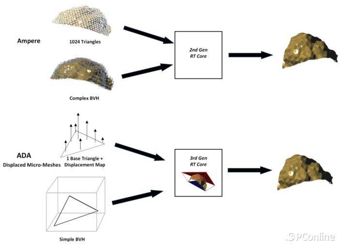 如果说Opacity Micromap Engine加速的是面处理,那么Displaced Micro-Meshes Engine就是几何曲面细节的加速器。如上图所示,在Ada Lovelace架构中,通过1个基底三角形+位移地图,就可以创建出一个高度详细的几何网格,所需要资源占用比二代RTX Cores更低,效率也更高。