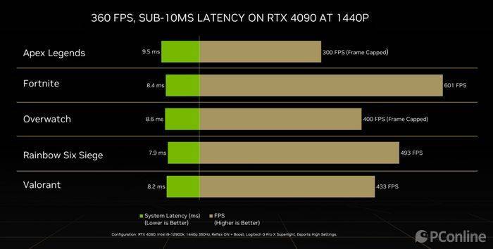 当GeForce RTX 40系列显卡和NVIDIA Reflex搭配上后,直接达到1440p分辨率360 FPS的体验,这着实是性能有点强劲了。