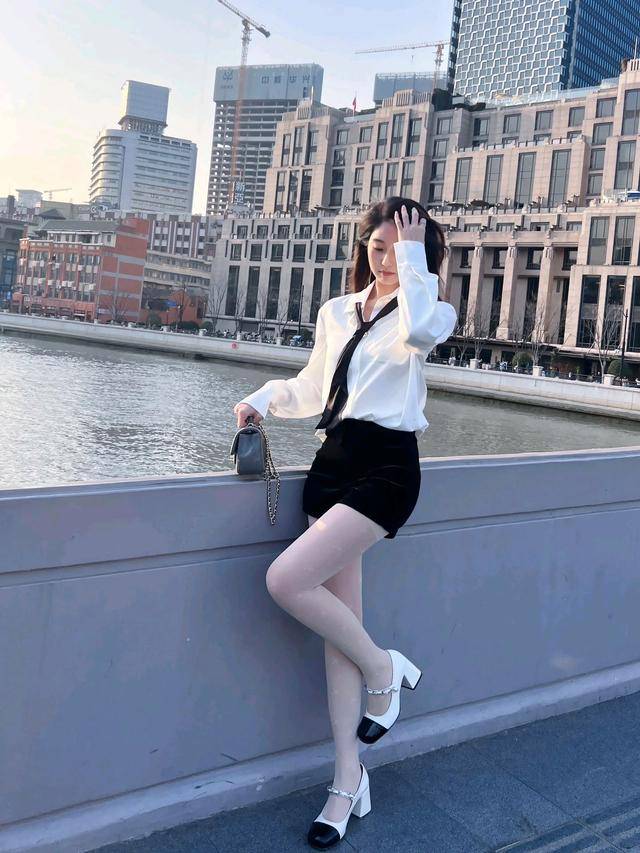 — 休闲街拍:宽松白色上衣搭配修身黑色裤子,展现纤细身材与休闲风格 —