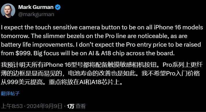 iPhone16 Pro预计维持999美元起步 A....推荐人:丁丁小编 发布时间:2024-09-09 13:05:02