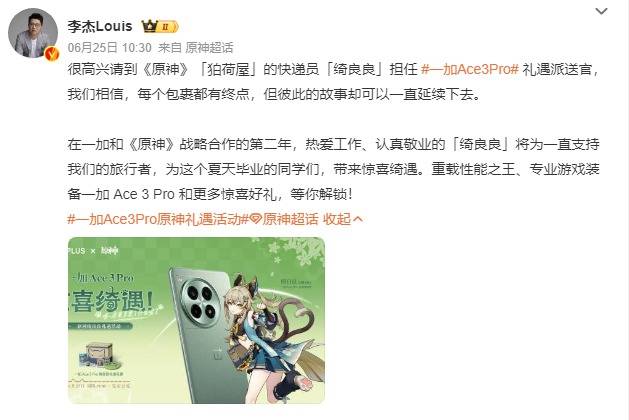 一加Ace 3 Pro携手《原神》推出绮良良礼遇活....推荐人:丁丁小编 发布时间:2024-07-05 12:05:00