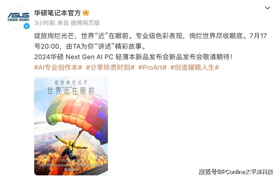 华硕新一代AI PC轻薄本7月17日发布,配置看点....推荐人:丁丁小编 发布时间:2024-07-05 12:10:00