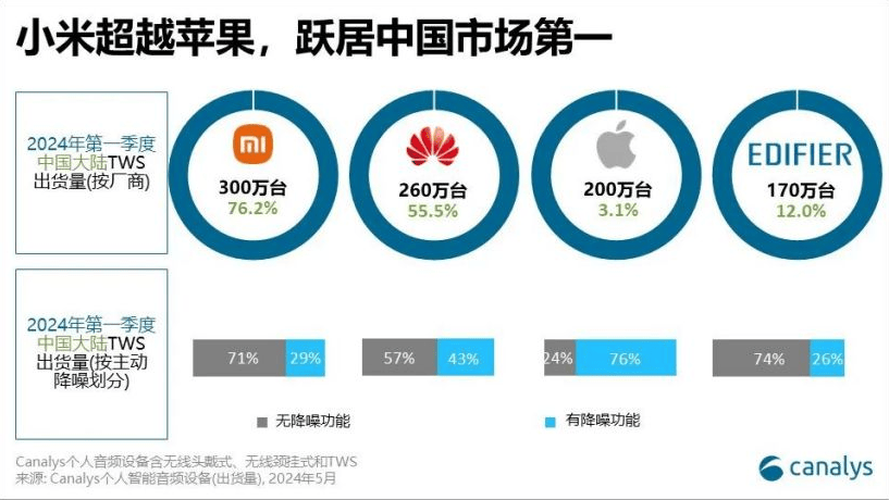小米TWS耳机份额大幅增长76.2% 华为紧随其后推荐人:丁丁小编 发布时间:2024-06-27 10:15:01