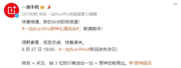一加官宣一加Ace 3 Pro原神定制版,快闪活动....推荐人:丁丁小编 发布时间:2024-06-24 13:05:00