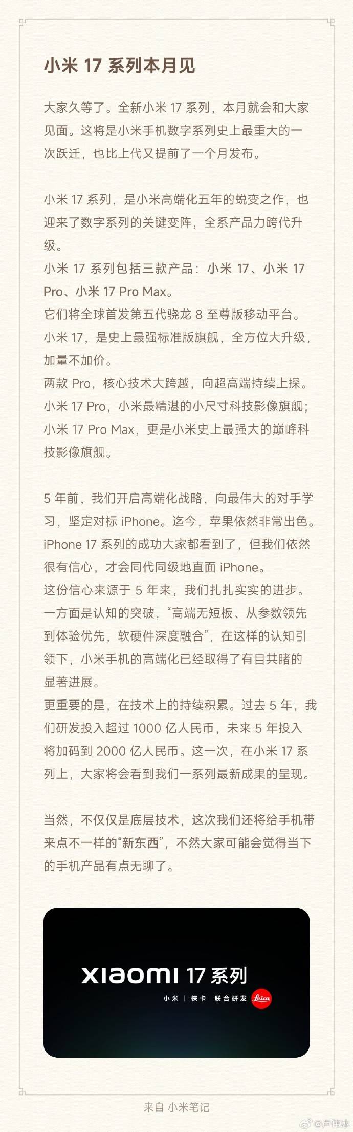 小米数字系列跨代升级 小米17系列将全面对标iPh....推荐人:丁丁小编 发布时间:2025-09-15 14:47:55
