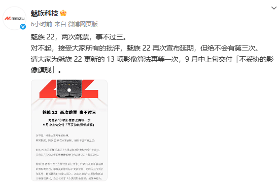 魅族22宣布再度延期至9月,高管回应:对品牌伤害很....推荐人:丁丁小编 发布时间:2025-08-22 16:47:59