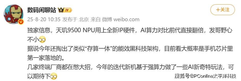 AI算力翻倍+黑科技架构!天玑9500最新独家信息....推荐人:丁丁小编 发布时间:2025-08-20 17:03:00