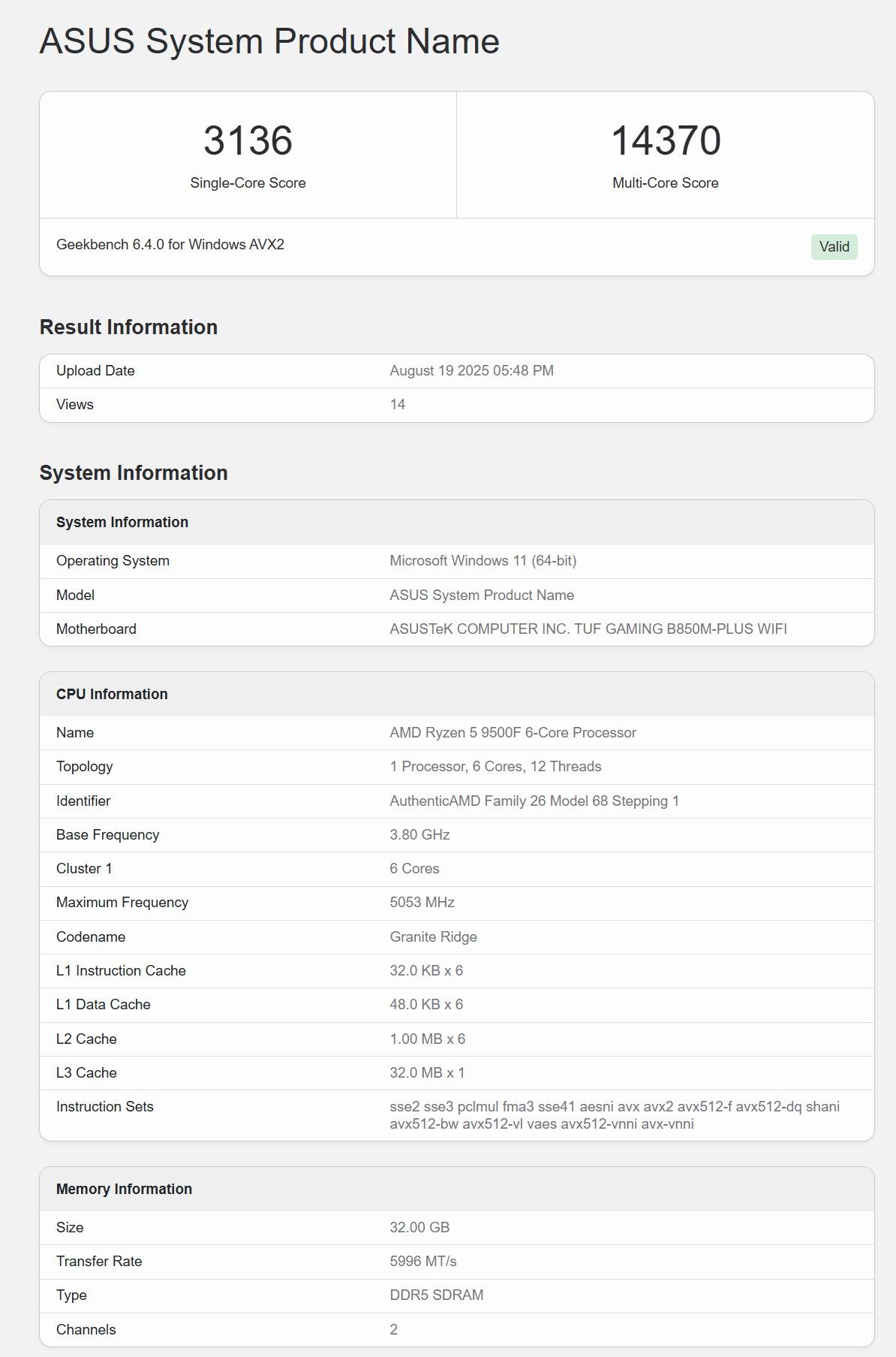 Geekbench数据库出现R5 9500F:Ze....推荐人:丁丁小编 发布时间:2025-08-20 11:36:00