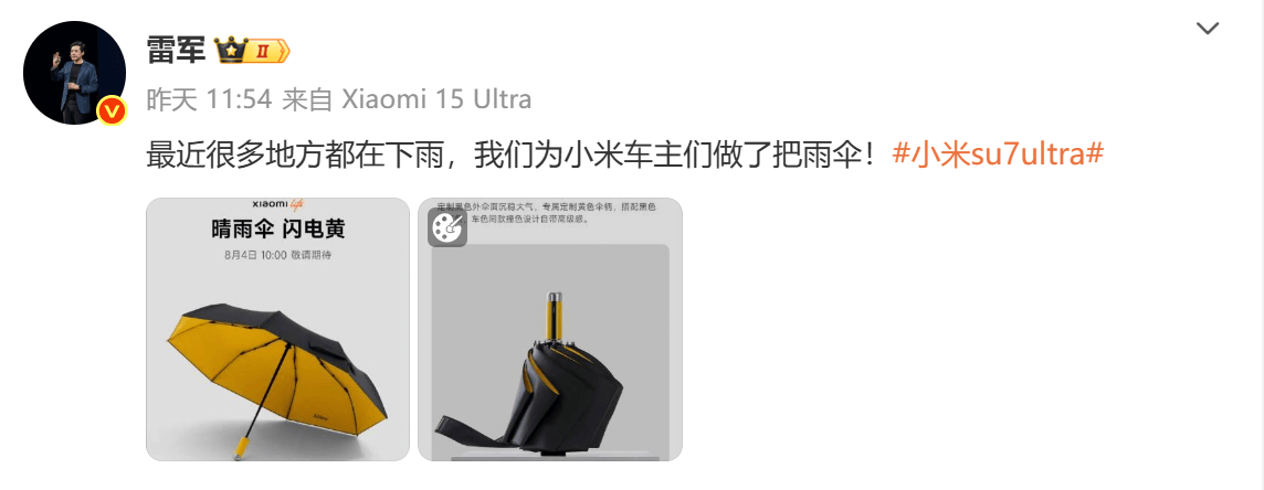 雷军称为小米车主做了一把伞 原生适配小米汽车收纳槽....推荐人:丁丁小编 发布时间:2025-08-04 18:30:03