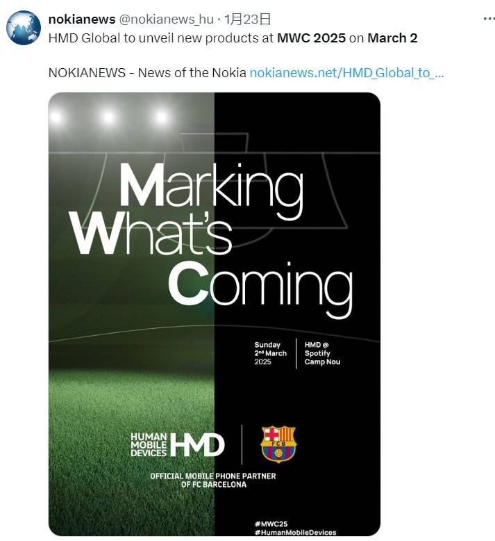 HMD Global成为巴塞罗那合作伙伴,将在MW....推荐人:丁丁小编 发布时间:2025-02-26 17:30:05