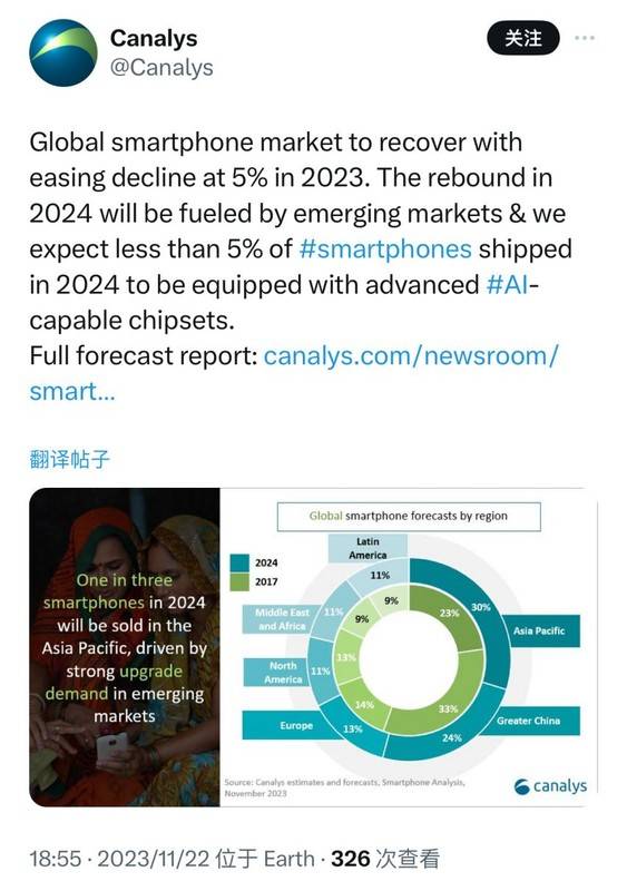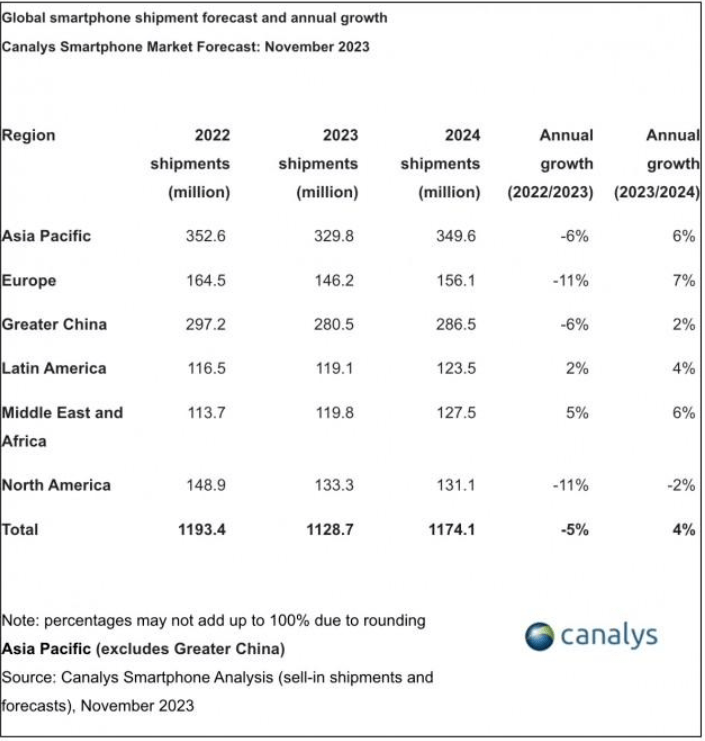 — Canalys预测:2024年全球手机出货量或将达到11.7亿台,呈增长趋势 —