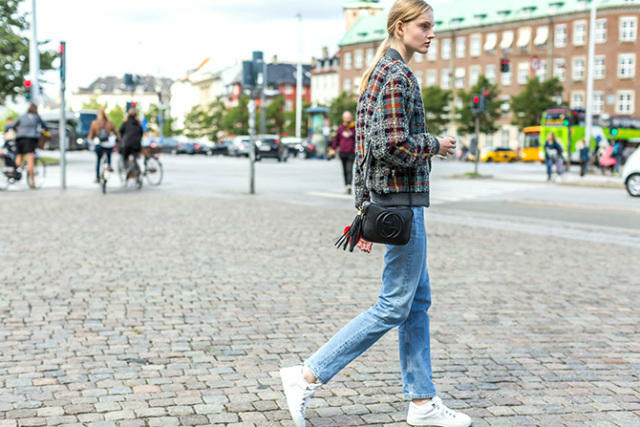 - 街拍:牛仔裤好看又百搭,搭配一字肩上衣很经典,百搭时尚