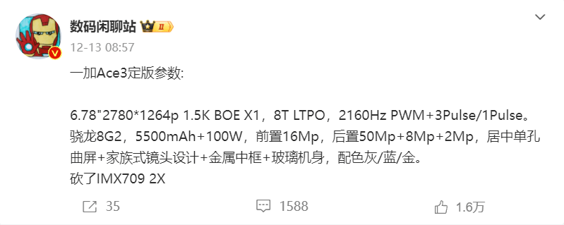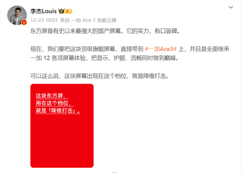 — 搭载行业最顶1.5K屏幕!一加Ace 3官宣1月4日发布 —