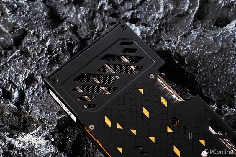 显卡的背面采用贯通式的金属背板,用以辅助散热。背板上则是延续了黑钻酷黑的设计,散落的棱形进行装饰,犹如钻石般一样。