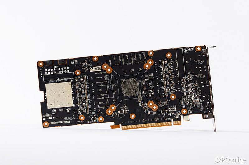 见识完精致的外观,就该看看这款显卡的内部构造了。拆解这款显卡还是比较容易的,首先要背板上的螺丝即可完成拆解出散热风扇,然后再将固定散热器的螺丝也拧下后,才能将PCB真正的分离。
