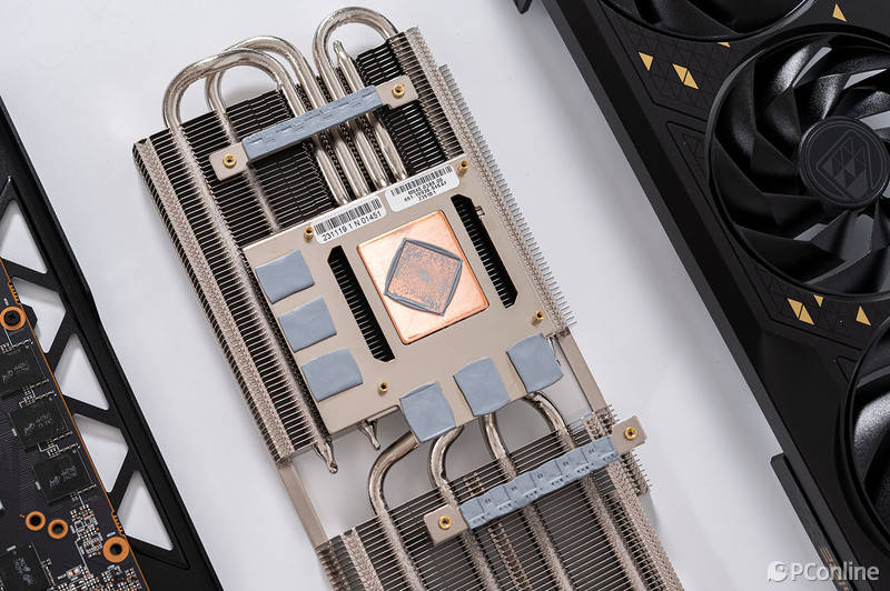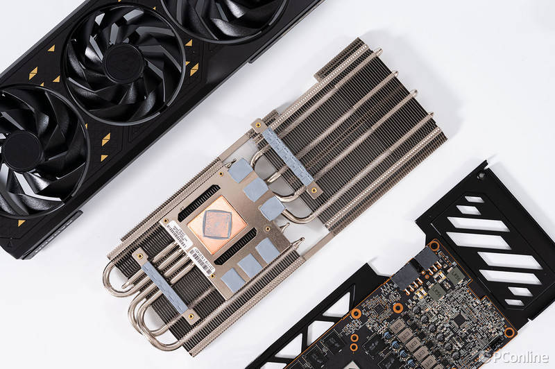 当然整张显卡让我最好奇的还是它的散热系统,拆开一看。不得不说这款显卡的散热堆料是真的足!像显存、电感部分都覆盖了高导热系数的导热垫,核心处的硅脂也是厚厚的一层。