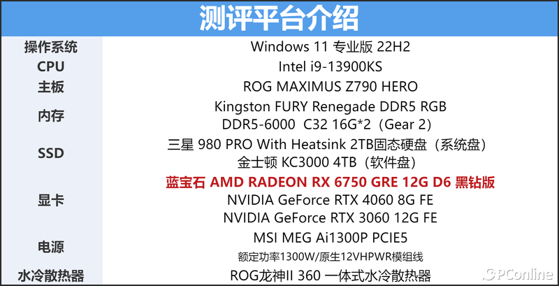 测试平台自然是使用旗舰级的平台,处理器为 i9-13900KS与ROG Z790 HERO的组合,而方面是两条Kingston FURY Renegade运行在DDR5-6000 C32模式下,这样平台有着更强的性能,同时稳定性也得到一定的保证。