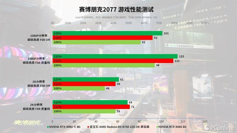 游戏的表现又能否像理论性能那么亮眼呢?首先是压力最大的“显卡杀手”《赛博朋克2077》,开启超级画质,不开FSR,这张显卡的帧数在1080P和2K分辨率下分别是92 FPS和58 FPS,都比RTX 4060高出10 FPS左右。开启FSR后,RTX 4060也无法在2K下做到流畅运行,而蓝宝石RX 6750 GRE 12G D6黑钻版则是来到了71 FPS,甚至反超了RTX 4060 Ti。