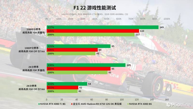 再看赛车竞速类游戏《F1 22》,这款游戏里,蓝宝石RX 6750 GRE 12G D6黑钻版领先隔壁RTX 4060,但是面对RTX 4060 Ti就不太行了。不过值得一提的是,1080P下开启FSR后已经可以做到高刷体验了,即使是压力比较大的2K分辨率,稍稍降低一些特效,2K@90Hz应该也不成问题。