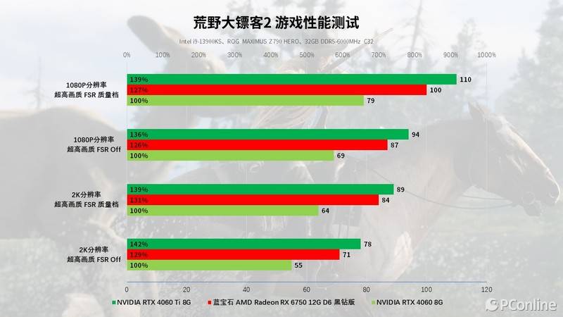 而在另一款3A大作《荒野大镖客2》里,又是另外一番景象。蓝宝石RX 6750 GRE 12G D6黑钻版即使不开FSR,2K下依旧可以保证60+FPS以上的游戏体验,反观RTX 4060,还无法达到60 FPS。并且此时蓝宝石RX 6750 GRE 12G D6黑钻版的游戏性能已经可以与RTX 4060 Ti相比了,整体游戏性能二者只在伯仲之间。