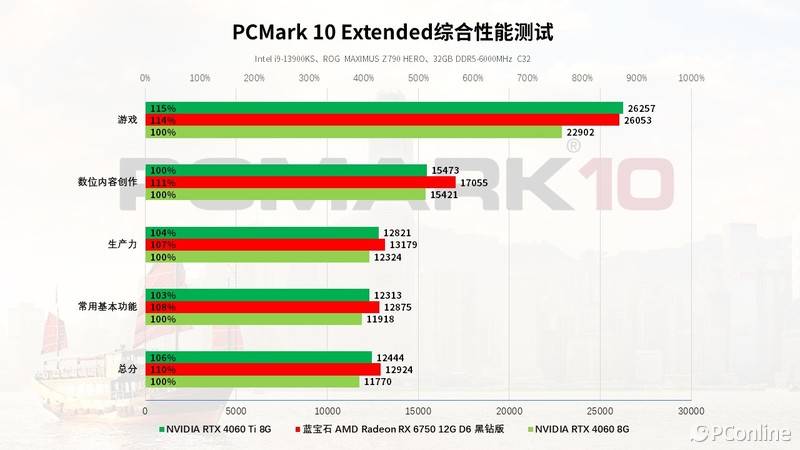 测完了游戏与创作,日常综合体验也是不少玩家关注的一环。这里我们选择PCMark 10 Extended进行测试,测试内容包括常用基本功能、生产力、数位内容创作以及游戏四部分,基于实际应用和活动的测试来衡量PC性能。