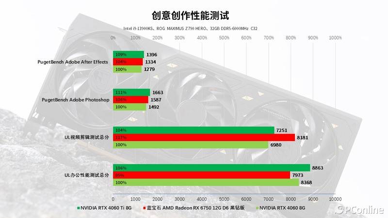 当然也不是所有用户都用显卡玩游戏,也有一部分用户关注它的创作性能。首先我们用UL Procyon对这款显卡进行一个基础测试,办公生产力方面,大家的表现不相上下,互有胜负。到了压力更大的UL视频编辑性能测试,蓝宝石RX 6750 GRE 12G D6黑钻版的表现力压RTX 4060 Ti,8181分的成绩远远甩开了RTX 4060 Ti,领先幅度来到了13%。