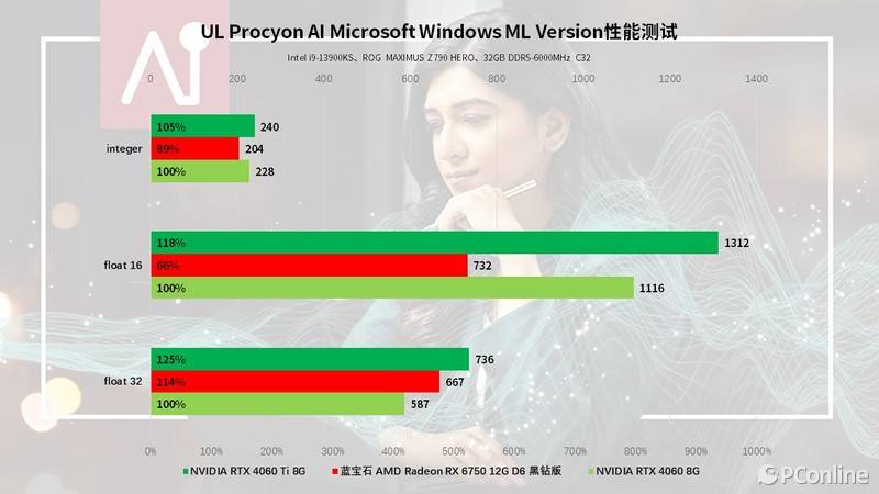 为了让大家对这张卡有个更直观的了解,我们这里也是用UL Procyon的AIGC测试对三款显卡的AI性能进行了评估。测试项目选的是UL Procyon的Microsoft Windows ML version,测试了包含float32、float16以及integer三个部分。