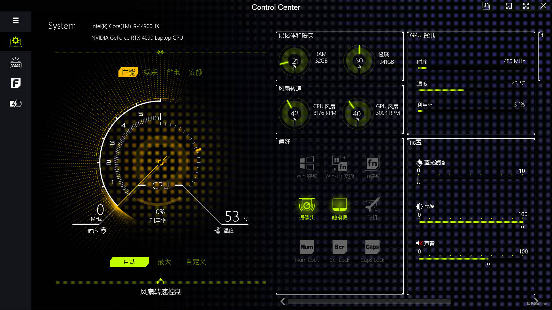 七彩虹将星X17 Pro Max共提供了四种性能模式设定,本篇文章的所有测试将全部运行在“性能模式”下,开启独显直连,风扇转速设定为自动。