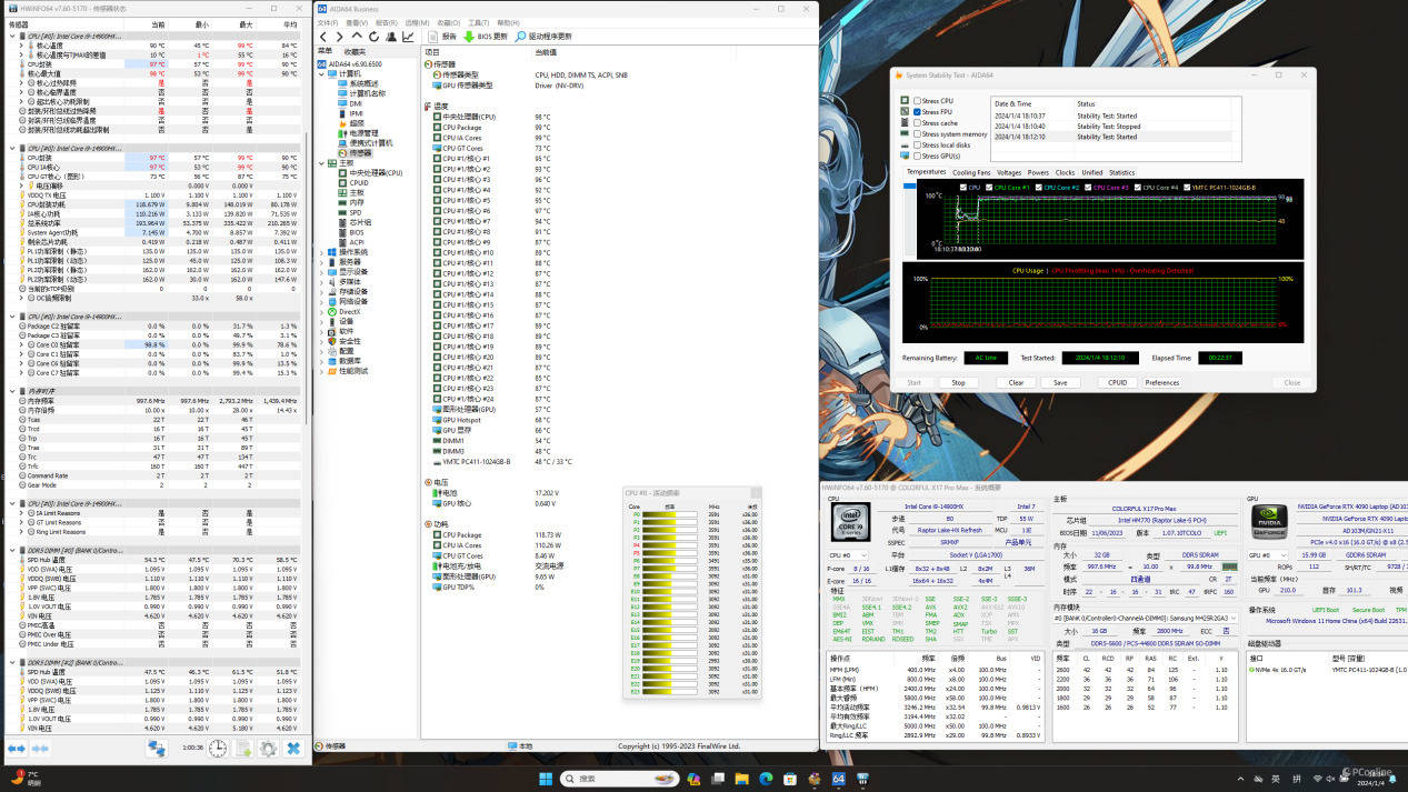 再开启AIDA 64中的系统稳定性测试,进行Stress FPU的CPU单烤测试,测试时间三十分钟,CPU功耗120W,P核心频率3.6GHz,E核心频率3.1GHz,温度98度。i9-14900HX在七彩虹将星X17 Pro Max中可以在一个相当高的功耗上稳定运行,可以代表i9-14900HX的真实性能表现。