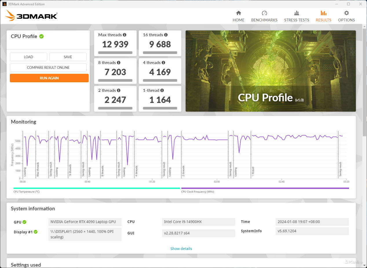 单线程得分1164,全线程得分12939。