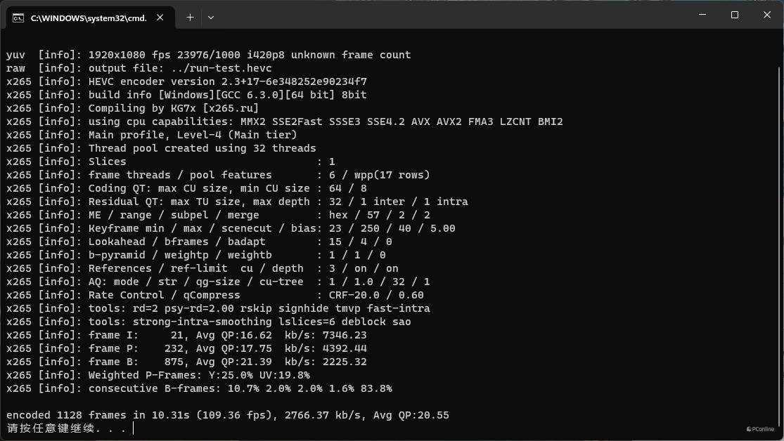 接下来是两项视频的编解码测试X264 FHD BenchMark、X265 FHD BenchMark,这两个软件同样只会调用CPU进行测试,在X264 FHD BenchMark中成绩为108.8fps,X265 FHD BenchMark中成绩为109.36fps。