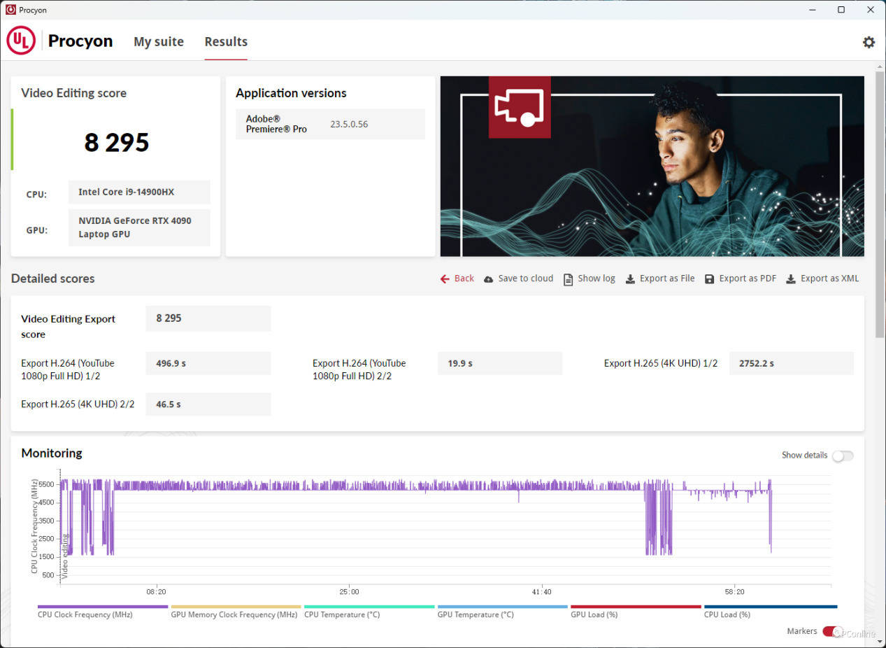 最后是UL Procyon中Video Editing项目测试,该测试会调用Adobe Premiere进行一系列的视频编辑、编解码等操作,最终的总分为:8295分。