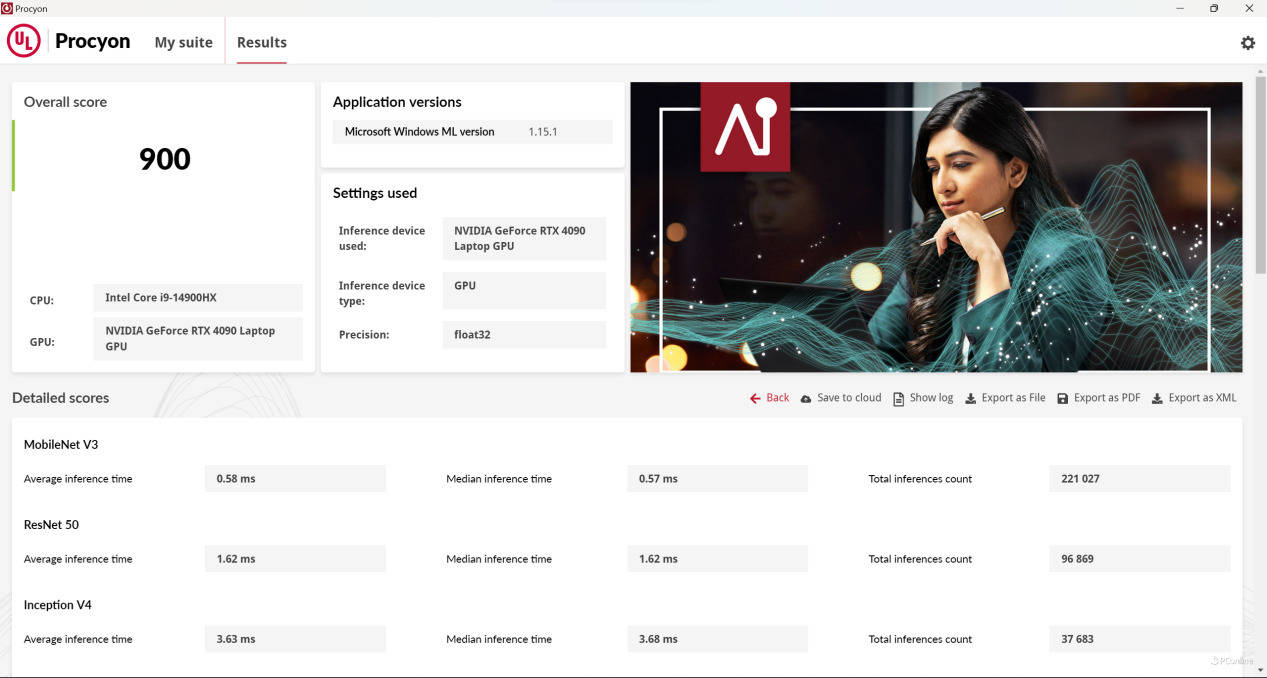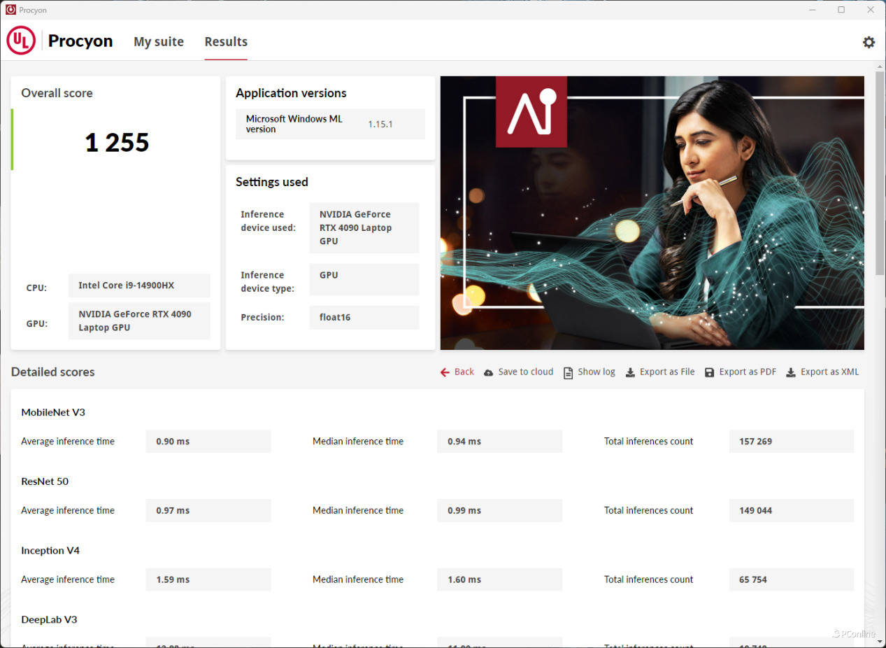 我们先来对其进行AI算力的基准测试,使用UL Procyon中的AI推理项目进行测试,选择微软的Windows ML API时,Float16半精度浮点性能评分1255分;Float32单精度浮点性能评分900分。