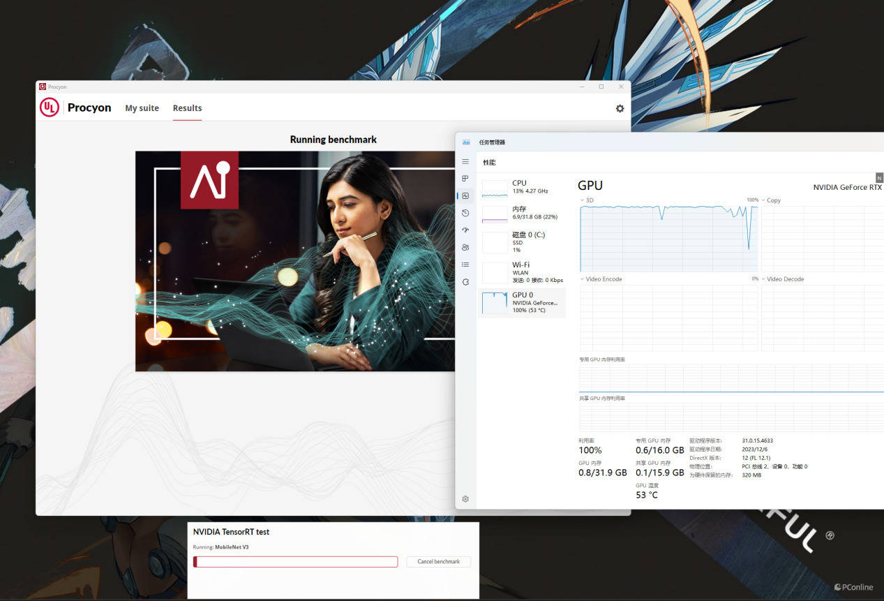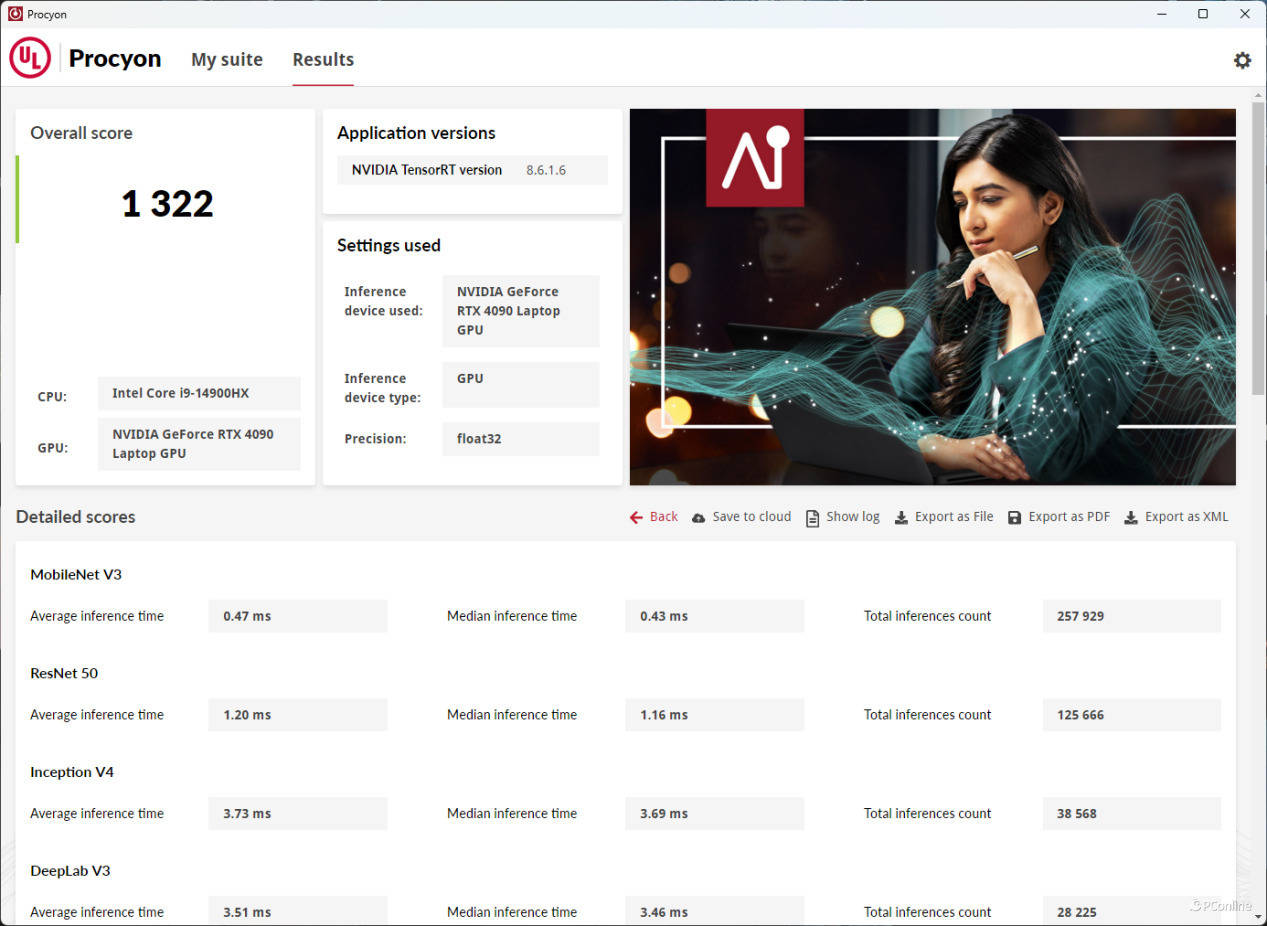 而如果选择NVIIDIA自家的NVIIDIA TensorRT API,Float单精度浮点性能评分为1322分,在测试时我们也发现,当选用自家API时,RTX 4090 Laptop GPU的调用会更加充分,可以达到100%满载,而在选用Windows ML API时占用则会降低到80%左右,这可能是在选用NVIIDIA TensorRT时可以获取到更高性能表现的主要原因之一,毕竟自家的API肯定对自家的GPU有更好的优化效果。