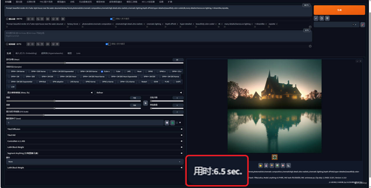 使用经常用来进行测试SD出图性能的“英伟达小屋”提示词进行测试,迭代步数50,采样方法选择Euler a,分辨率768*768,单次单张出图的所需时间仅为6~7s左右。
