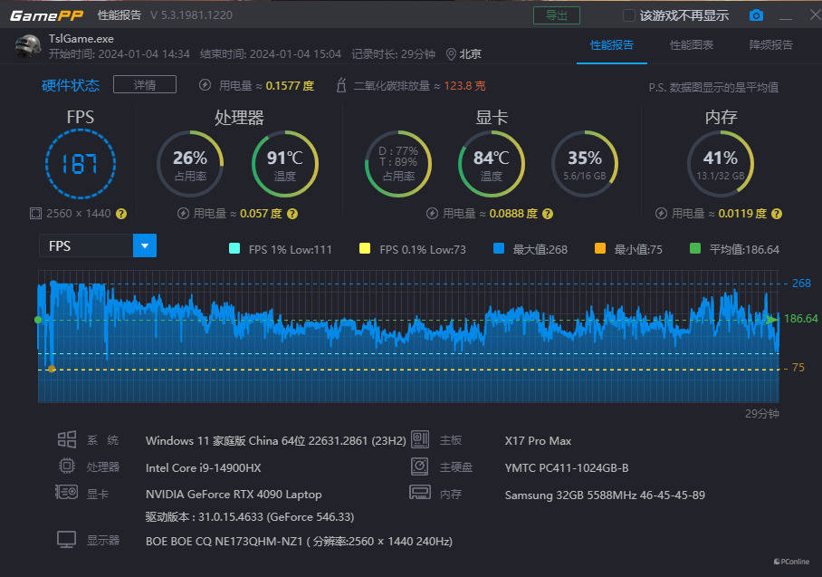 首先是竞技网游《PUBG》,2.5K分辨率+预设超高画质,在海岛地图中进行一场第三人称四排游戏,自动填充队友,死后观看直到整局游戏结束,最终平均帧数为187帧。
